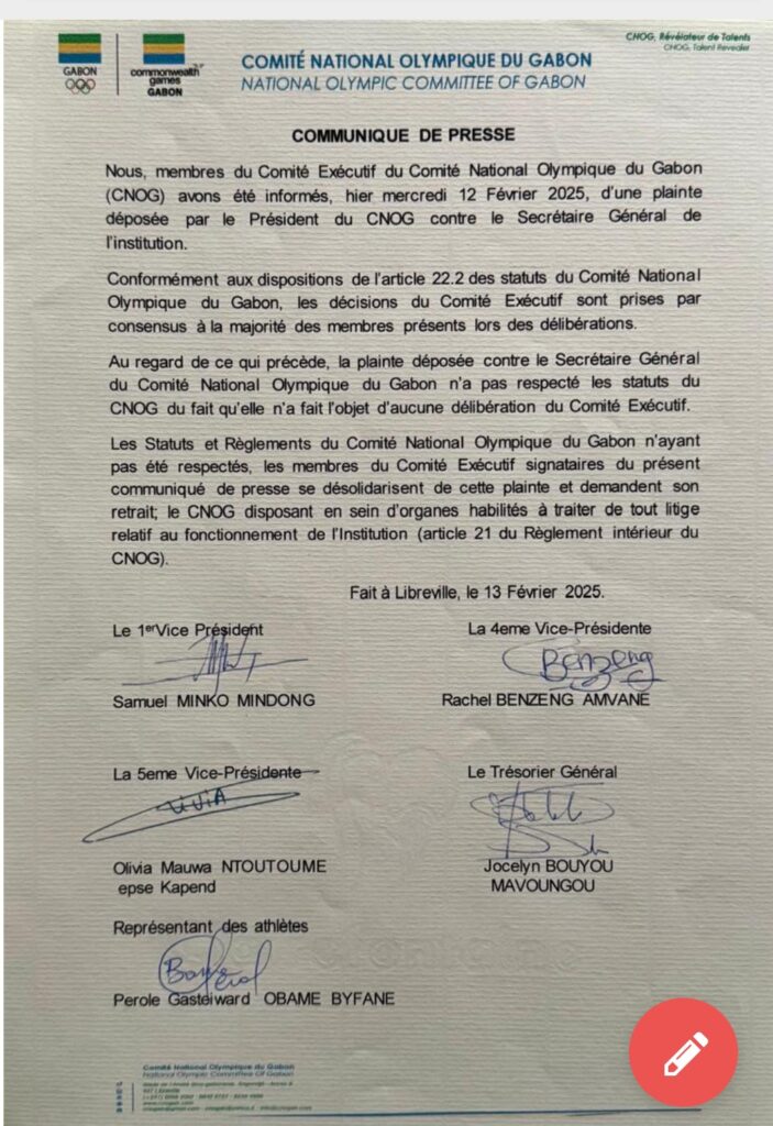 Libreville , le 22 février 2025 ( Cafesportplu.ga ) . Nous venons de recevoir une copie d’un communiqué du Comité national olympique du Gabon , signé des membres du Comité exécutif , lequel fait état de l’éviction à la présidence de cette institution de Cresant Pambo.