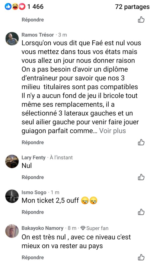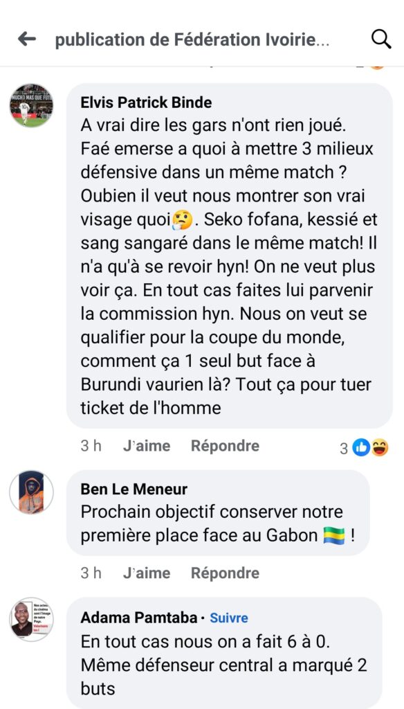 Franceville , le 6 septembre 2026 ( Cafesportplus.ga) . Réalisant l’essentiel hier soir (1-0) face au Burundi , le public Ivoirien n’a pas été tendre envers sa sélection nationale de football et son staff technique . Décrié par le public sur la toile , Emerse Fae semble ne pas convaincre et la mauvaise prestation des Éléphants le 5 septembre devant le Burundi inquiète les Ivoiriens . Nous vous invitons à découvrir certains de ces commentaires..